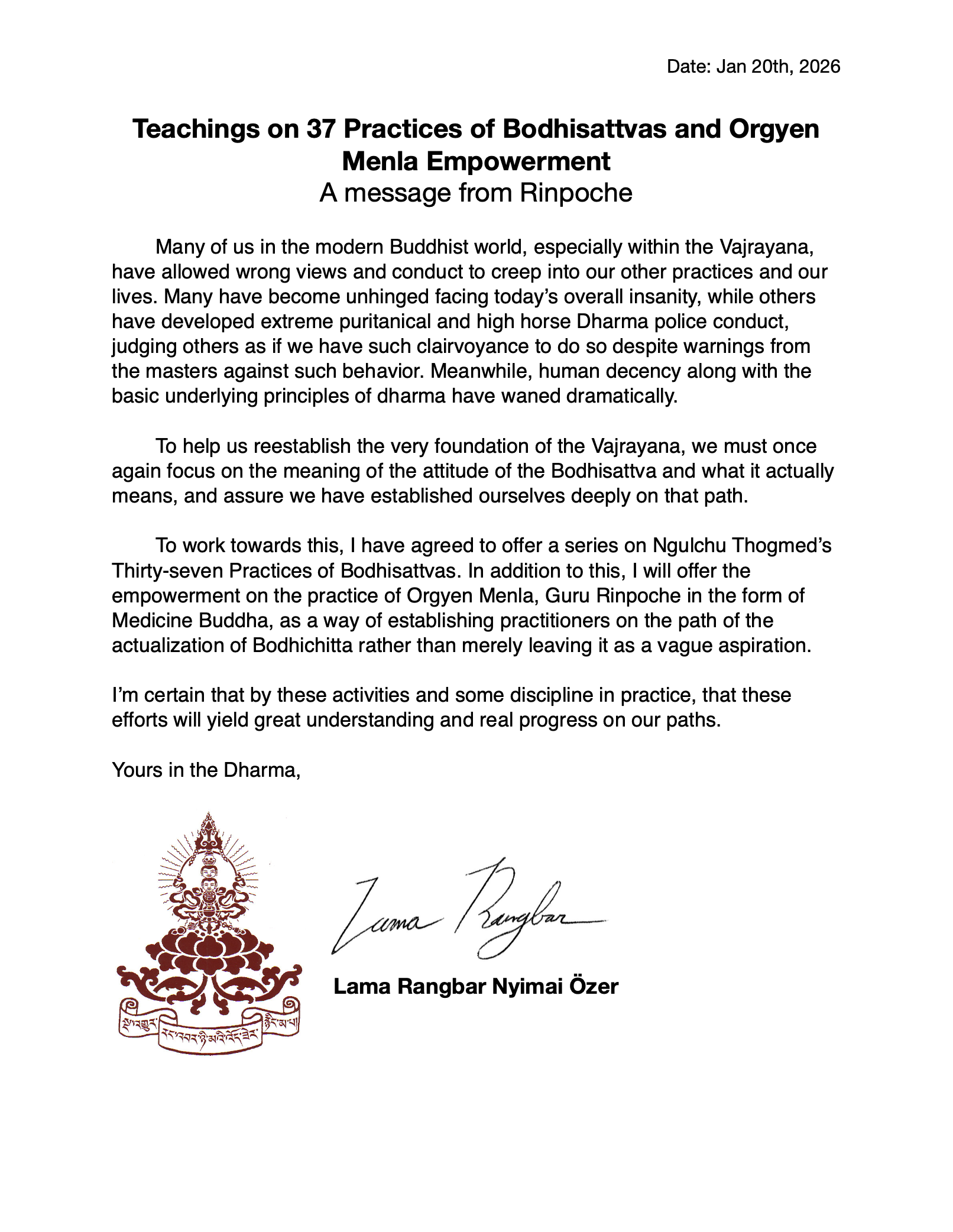 Lama Rangbar Rinpoche’s teachings based on Ngulchu Togme’s 37 Practices of Bodhisattvas will take place in person (limited seating) at Ngakdra Labrang and on Zoom on Sundays from 9am - 1pm EST (UTC -5) on: January 25th, February 1st, & February 8th. All teaching sessions have now been completed.
